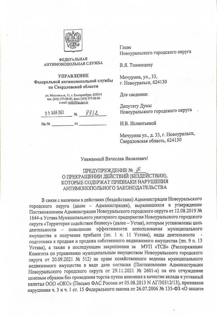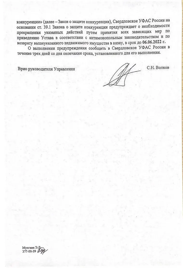В предупреждении идет речь о том, что ООО «ОКС», подконтрольное администрации, в качестве юридического адреса в уставном капитале указало здание бывшего детского садика по улице Ленина, 25, которое ОКСу передало муниципальное унитарное предприятие «Территория содействия бизнесу». «По приведению устава в соответствии с антимонопольным законодательством и по возврату вышеуказанного недвижимого имущества в казну», — говорится в предупреждении ФАС. Администрацию предупредили о необходимости исполнить предупреждение до шестого июня 2022 года. Корреспонденту URA.RU в УФАС подтвердили, что такое предупреждение было выдвинуто.
