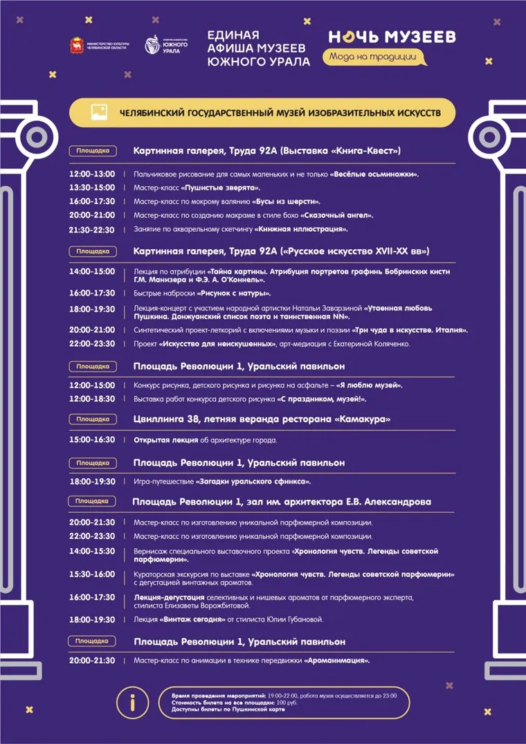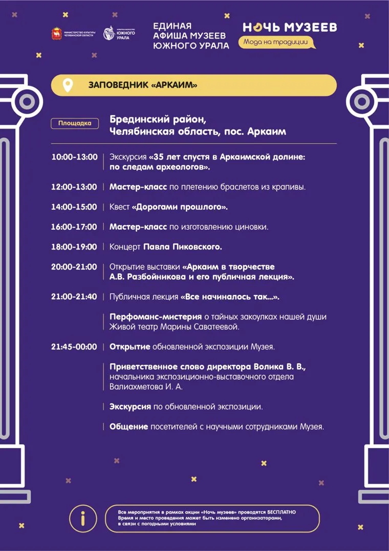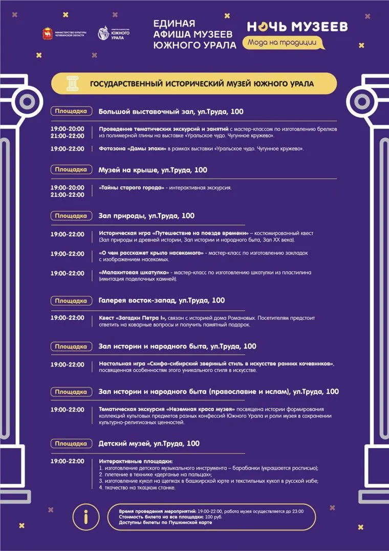 В этот день для южноуральцев проведут экскурсии, выставки, лекции, мастер-классы, а также мероприятия в разных форматах оффлайн/онлайн. К «Ночи музеев» присоединятся частные галереи, театры и учебные заведения. Мероприятия перечислены в специально подготовленных для жителей региона афишах. Полностью программу мероприятий, до отдельных муниципалитетов включительно, можно посмотреть здесь .