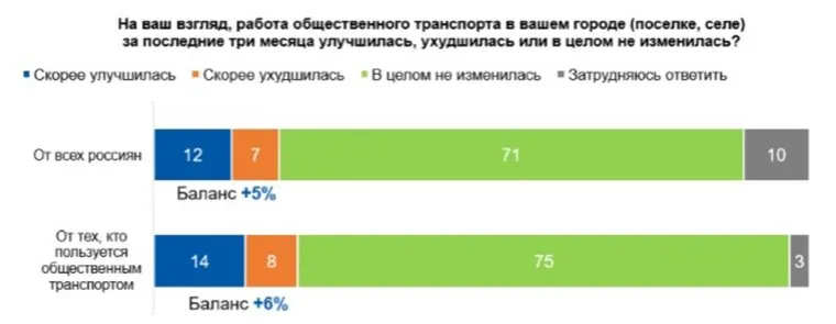 Сообщается также, что за последние три месяца граждан, которые удовлетворены качеством услуг в транспорте, стало больше. «Из всех опрошенных 12% россиян отмечают улучшения в работе», — отмечается в исследовании.