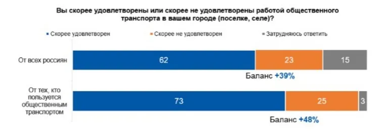 «62% всех опрошенных скорее удовлетворены работой общественного транспорта. 47% уверены, что санкции никак не повлияют на качество его работы», — говорится в пресс-релизе центра социсследований, который есть в распоряжении URA.RU.