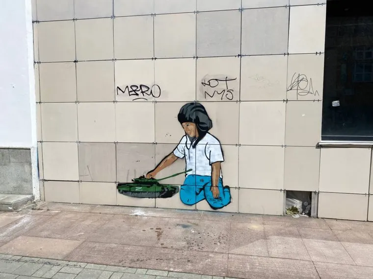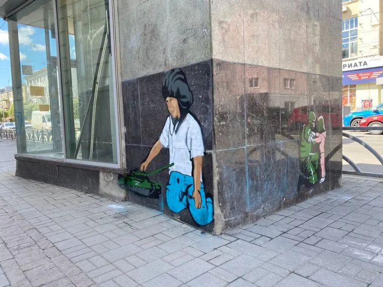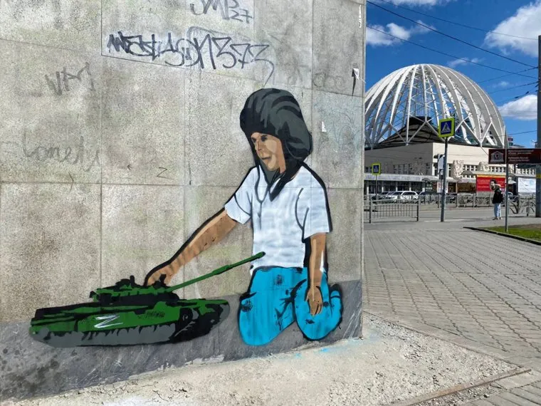 В Екатеринбурге на улицах города появились граффити с ребенком, который играет танком с буквой Z. Часто рисунки находятся возле тех работ, на которых изображен солдат с девочкой, сообщили читатели URA.RU. Выяснилось, что на рисунке изображен мальчик Леха из Белгородской области — недавно он прославился на видео, которое быстро разлетелось по интернету. Мальчик отдавал честь российским военным, проезжавшим по дороге.