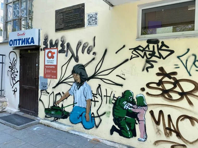В пяти метрах от этого граффити также есть рисунок с солдатом и девочкой