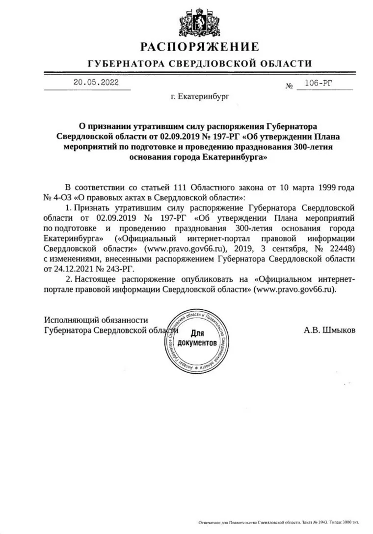 «Признать утратившим силу распоряжение губернатора Свердловской области от 02.09.2019 „Об утверждении плана мероприятий по подготовке и проведению празднования 300-летия основания Екатеринбурга“», — говорится в указе, подписанном 20 мая.