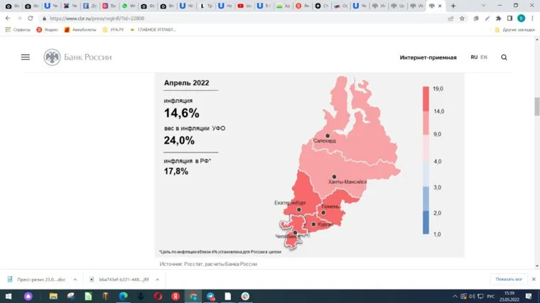 «Годовая инфляция в Челябинской области в апреле по сравнению с мартом 2022 года ускорилась до 14,63%, что ниже показателя по УрФО (15,21%) и России в целом (17,83%). Ускорение инфляции, как и в целом по стране, во многом вызвано ростом издержек производителей и поставщиков, сокращением предложений непродовольственных товаров из-за нарушений в производственных и логистических цепочках в условиях санкций», — заявили в ЦБ.