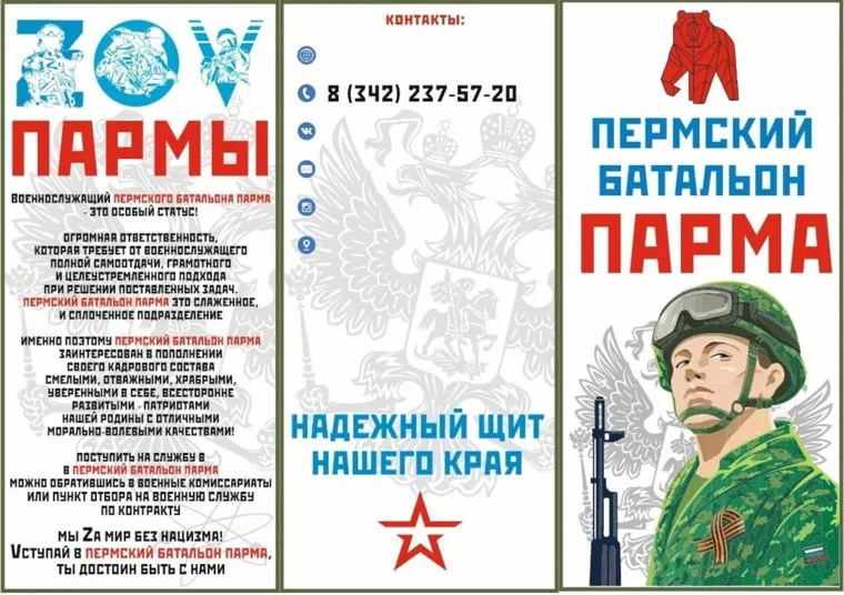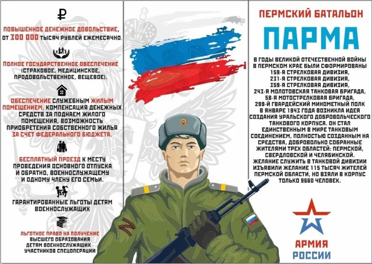 Желающим вступить в батальон обещают ежемесячное денежное довольствие в размере 300 тысяч рублей, обеспечение служебным жильем, бесплатные проезд к месту проведения отпуска. О сроках контракта и его условиях пермяки могут узнать в военкомате по месту регистрации. В опубликованном сообщении также указан номер телефона пункта отбора на военную службу по контракту города Перми, по которому можно уточнить всю интересующую информацию.