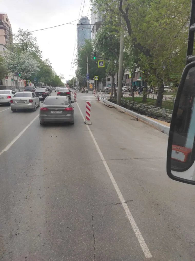 На улице Белинского в Екатеринбурге образовалась пробка от улицы Куйбышева до Малышева. Об этом URA.RU сообщили очевидцы, предположившие, что транспортный коллапс связан с установкой поребриков.