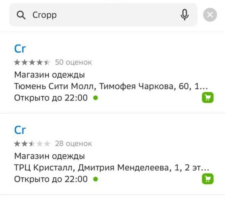 Скриншот: новое название магазина Cropp в 2ГИС