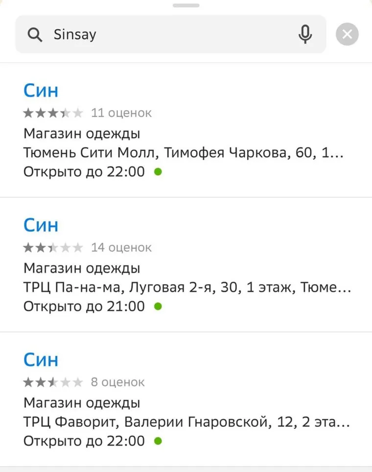 Скриншот: новое название магазина Sinsay в 2ГИС