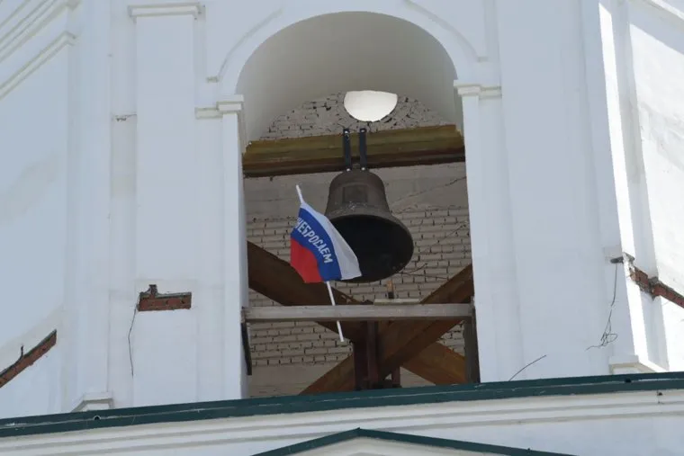 На колокольне храма святых Симеона и Анны в Сысерти повесили российский флаг с надписью в поддержку военных, участвующих в спецоперации по денацификации и демилитаризации Украины. Об этом сообщает корреспондент URA.RU с места событий.