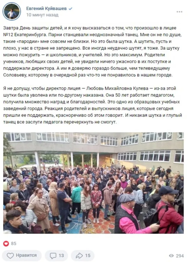 Утром 31 мая телеведущий Владимир Соловьев раскритиковал екатеринбургский лицей №12 , где учащиеся устроили танец, в котором можно усмотреть «признаки ЛГБТ*». Директор лицея Любовь Кулева говорила URA.RU, что не видит в творчестве своих воспитанников ничего дурного . В мэрии также дали понять , что вышло недоразумение: дети неудачно спародировали молодежный клип. Однако региональный министр образования Юрий Биктуганов позднее заявил, что Кулеву нужно уволить. Родители собирают подписи в поддержку директора.