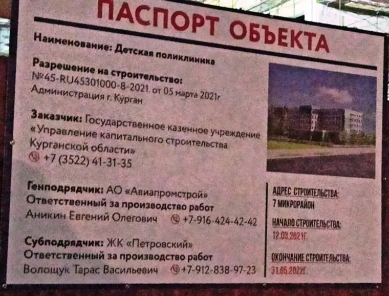 В Кургане в седьмом микрорайоне Заозерного затягивается строительство детской поликлиники. Согласно информации в паспорте объекта строительные работы должны были закончить еще 31 мая. Однако в документах на сайте госзакупок срок исполнения контракта — 30 июня.
