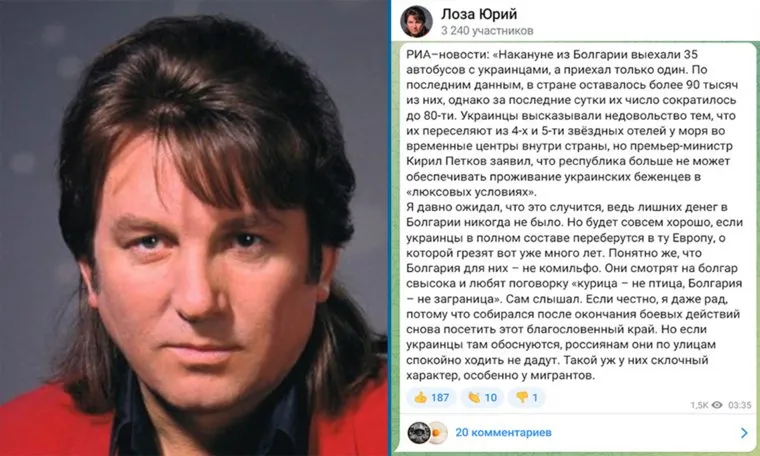 Композитор и исполнитель из Екатеринбурга Юрий Лоза заявил, что «будет хорошо, если украинцы в полном составе переберутся в Европу». Заявление артист сделал в своем telegram-канале из-за новости об украинцах-мигрантах, покинувших Болгарию.