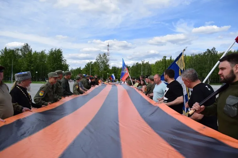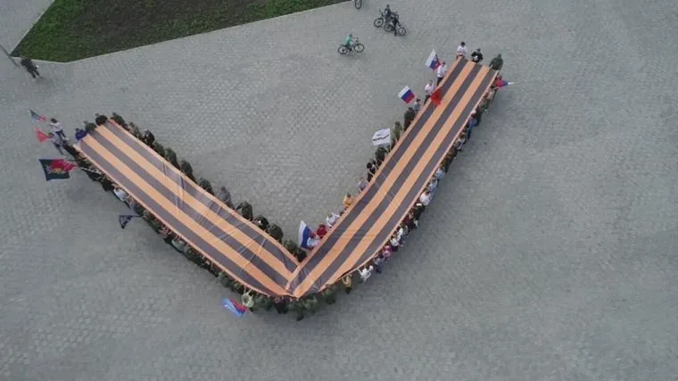 Участники вытягивают георгиевскую ленточку в виде буквы V