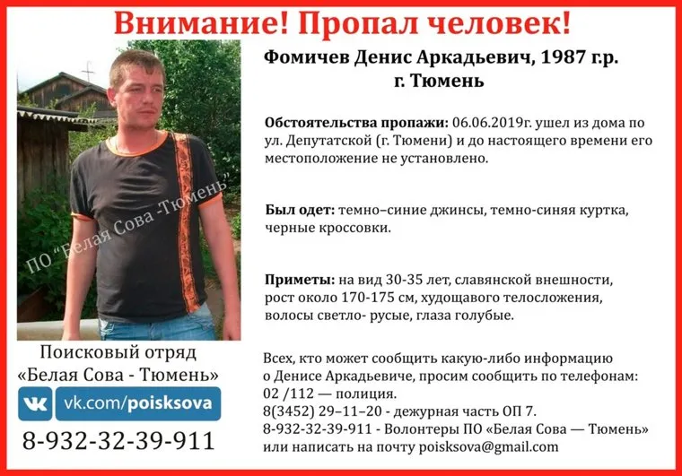 «Фомичев Денис Аркадьевич (1987 года рождения) до сих пор не найден! 6 июня 2019 года мужчина вышел из дома на улице депутатской в Тюмени и пропал», — рассказали URA.RU в поисковом отряде «Белая Сова — Тюмень».