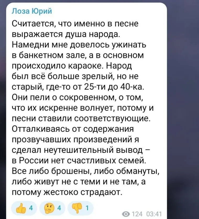 «Мне довелось присутствовать на одном банкете, на котором зрелые люди пели в караоке. Они исполняли сокровенные песни, которые отражали их состояние. Отталкиваясь от содержания песен, сделал неутешительный вывод, что в России нет счастливых семей», — говорится в сообщении.