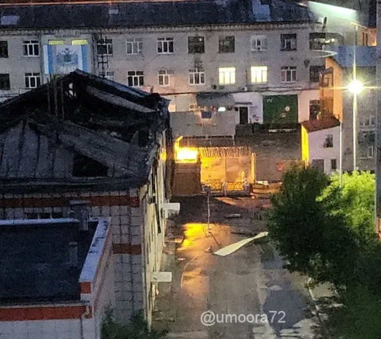 После пожара в здании автобазы Тюменской областной думы сильный ветер начал разносить остатки крыши. Фотографии с упавшими обломками кровли появились в telegram-канале «Тюменская Z уМоора».