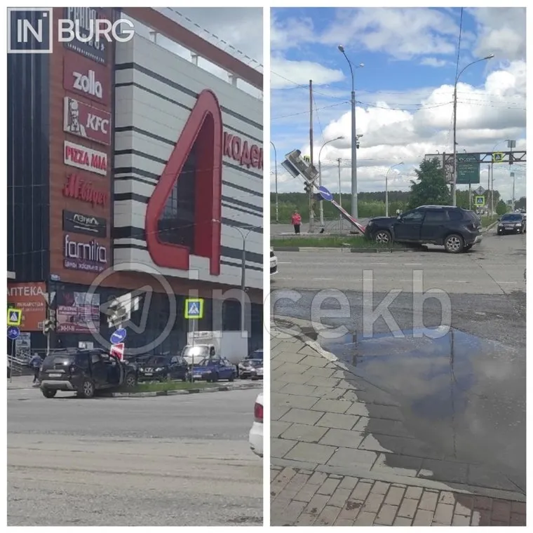В Екатеринбурге на перекрестке улиц Вильгельма де Генина и Краснолесья КАМАЗ влетел в кроссовер «Рено», который затем снес светофор. Об этом URA.RU сообщил читатель.