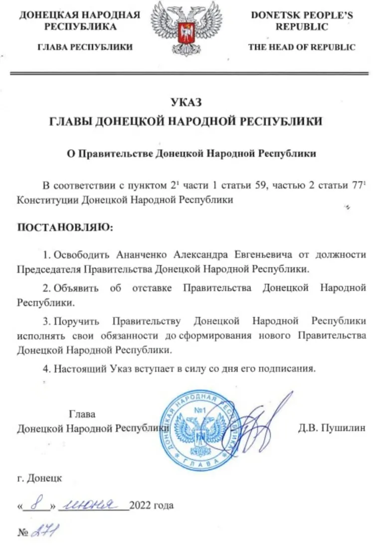 «Освободить Ананченко Александра Евгеньевича от должности председателя правительства Донецкой народной республики», — сказано в указе. Также в отставку отправлено все правительство ДНР.