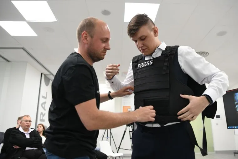 Студентам предложили примерить бронежилет, в котором журналист работал в Донбассе