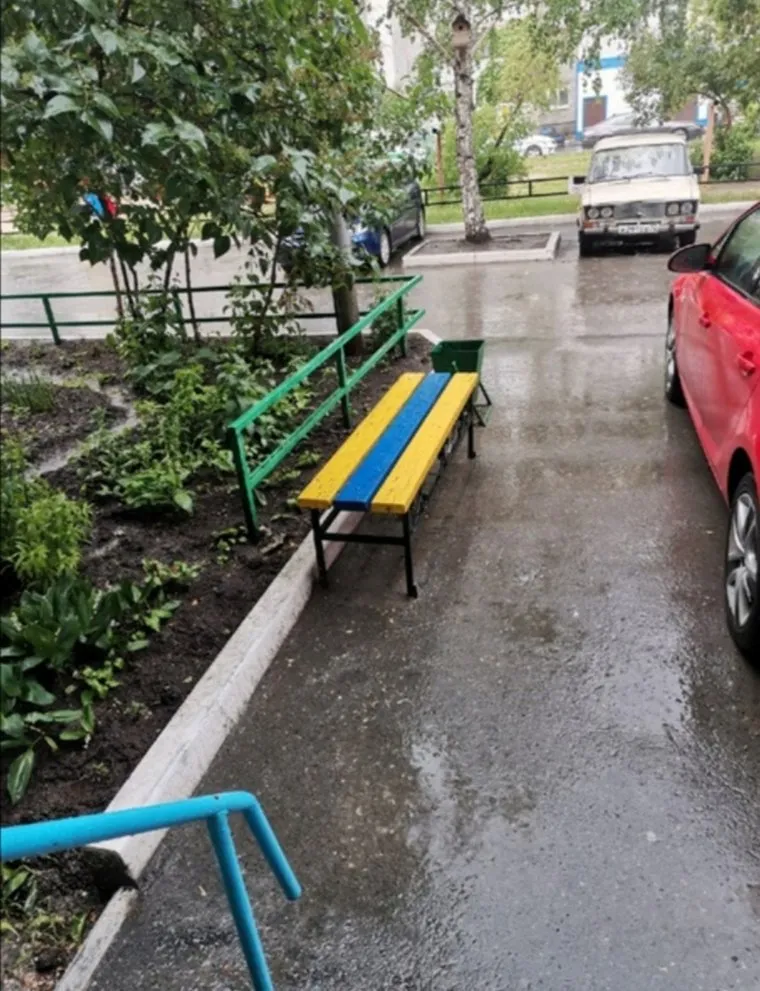 Во дворе Тюмени обнаружили скамейку в желто-голубом цвете