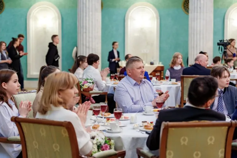 Традиционный прием организовали в большом колонном зале дома Севастьянова — церемониальной части губернаторской резиденции. Для выдающихся подростков накрыли столы с угощениями: печеными пирожками, фруктами и пирожными. К ланчу присоединились и свердловские чиновники — по одному за каждый стол. Под инструментальные мелодии с детьми беседовали заместители губернатора Павел Креков и Валерий Чайников, министр спорта Леонид Рапопорт, первый замминистра культуры Юлия Прыткова, детский омбудсмен Игорь Мороков и сам Куйвашев.