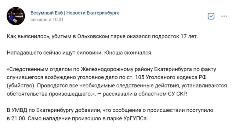 В Екатеринбурге запустили фейк о зарезанном в парке подростке. Скрин