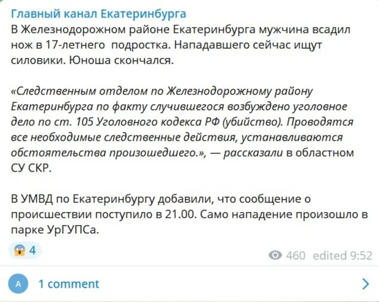 Сообщение о 17-летнем погибшем появилось в городском telegram-канале