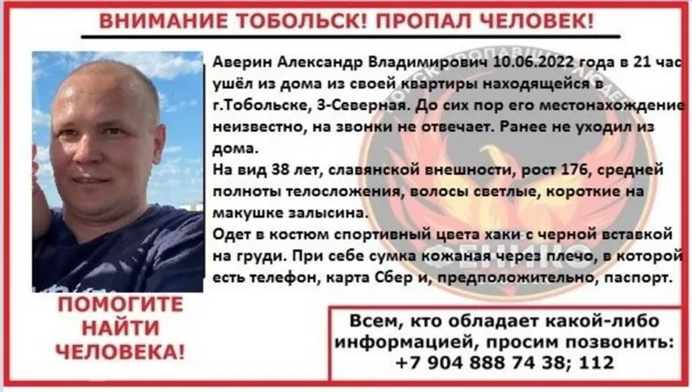 «Александр Аверин ушел из своей квартиры в Тобольске (улица 3-я Северная) 10 июня в 21:00. До сих пор его местонахождение неизвестно. На звонки не отвечает, ранее из дома не уходил», — сообщили URA.RU в «Фениксе».