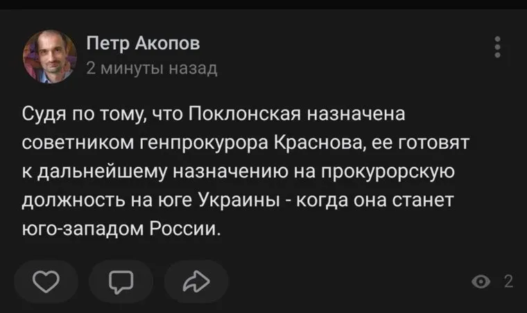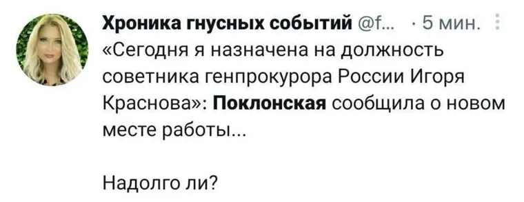 Президент РФ Владимир Путин подписал указ об увольнении Поклонской с должности экс-замглавы Россотрудничества 13 июня. На следующий день, 14 июня, она стала советником Генпрокурора РФ. Она также была прокурором Крыма, депутатом Госдумы и послом в Кабо-Верде. В Генеральной прокуратуре РФ подтвердили назначение экс-чиновницы.