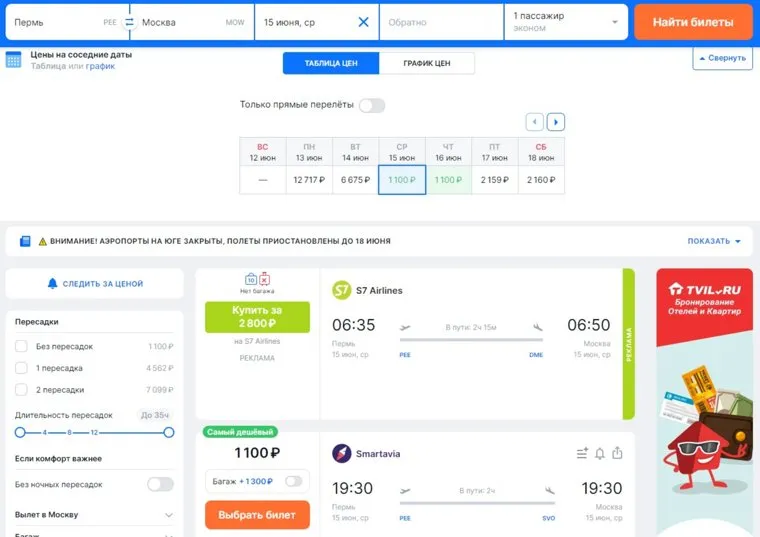 Авиаперевозчики, летающие по маршруту Пермь — Москва, значительно снизили цены в июне на перелет в столицу России. Цены на сайте агрегатора Aviasales начинаются от 1100 рублей, выяснили в редакции URA.RU.