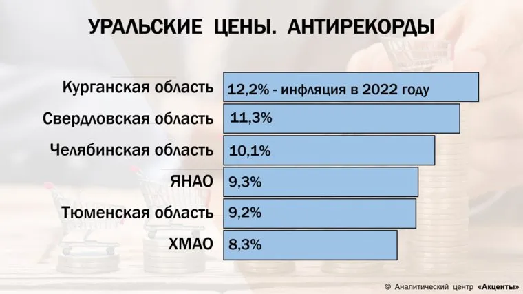 «Курганская область. Увеличение инфляции в 2022 году — 12,2%. Главные „виновники“ подорожания — молочные и кондитерские продукты, сахар, бытовая техника, электроника и услуги туризма», — говорится в сообщении. Несмотря на то, что Курганскую область принято считать уральскими «воротами» для импортной продукции, в Ханты-Мансийском автономном округе, где логистика импорта гораздо сложнее, товары и услуги подорожали с начала года всего на 8,3%.