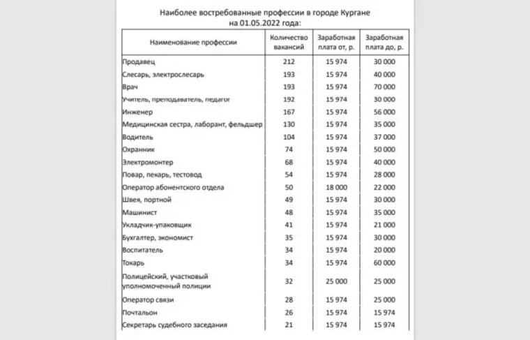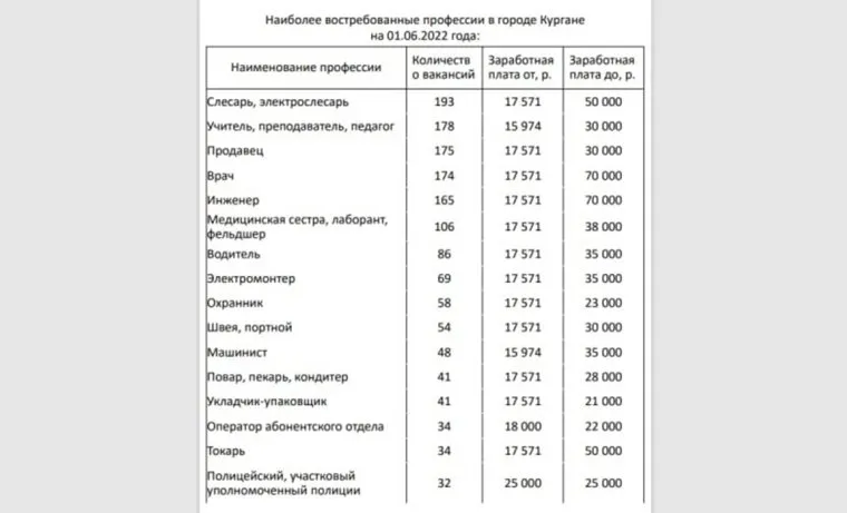 «На 1 июня в Кургане на первом месте оказались слесари, на них открыты 193 вакансии на зарплату от 17,5 до 50 тысяч рублей. За ними следуют учителя (178 вакансий) и продавцы (175) с максимальной зарплатой в 30 тысяч. Затем идут врачи (174) и инженеры (165) с зарплатами от 17,5 до 70 тысяч. За ними следуют фельдешры и медсестры (106), а также водители (86)», — говорится в данных таблицы.