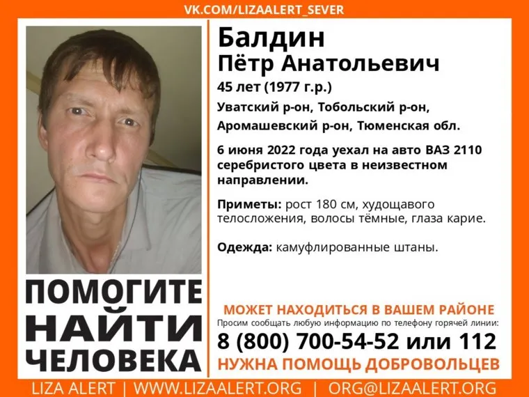 «45-летний Петр Балдин 6 июня уехал на авто ВАЗ-2110 серебристого цвета в неизвестном направлении. Информации о нем с того момента нет. Мужчина может находиться в Уватском, Тобольском, Аромашевском районах региона», — рассказали URA.RU в «Лиза Алерт» Тюменской области.