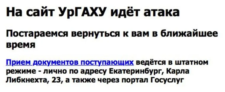 «На сайт УрГАХУ идет атака. Постараемся вернуться к вам в ближайшее время. Прием документов поступающих ведется в штатном режиме», — сообщается на сайте архитектурно-художественного университета.