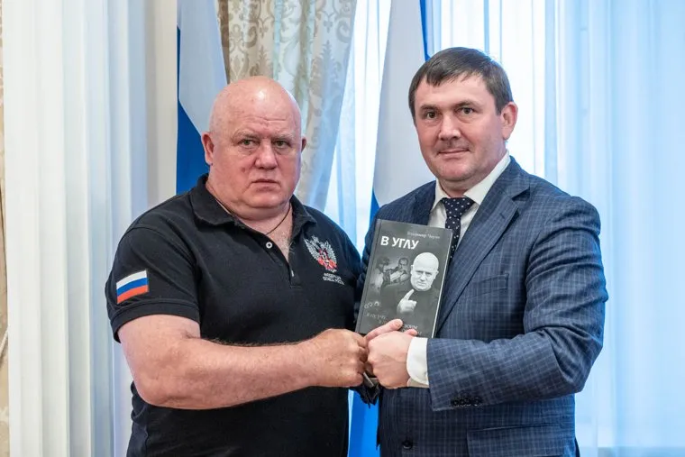 Заслуженный тренер СССР по боксу Владимир Черня (на фото слева) подарил свою книгу «В углу» Алексею Шмыкову (на фото справа)