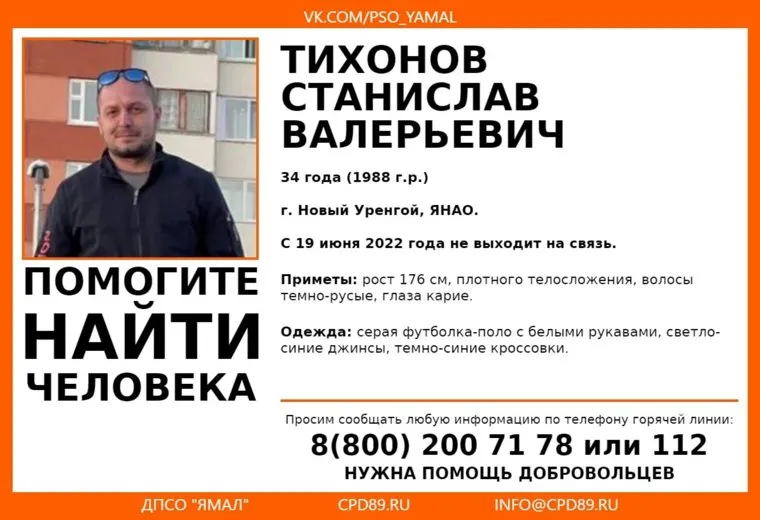«Внимание! Помогите найти человека! Тихонов Станислав Валерьевич, 34 года, Новый Уренгой, ЯНАО. С 19 июня 2022 года его местонахождение неизвестно», — говорится в сообщении.
