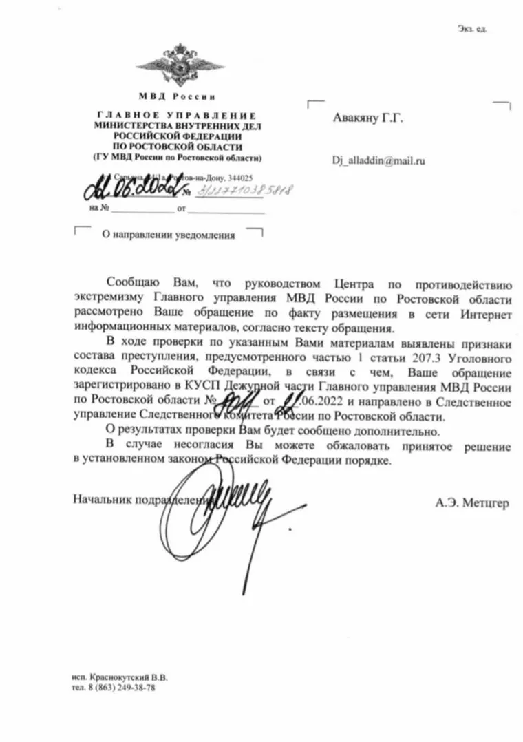 Центр по противодействию экстремизму ГУ МВД РФ по Ростовской области уведомил блогера, что обнаружили признаки преступления, предусмотренного частью 1 статьи 207.3 УК РФ (Публичное распространение заведомо ложной информации об использовании ВС РФ, исполнении государственными органами РФ своих полномочий). Потому, отмечается в документе, обращение Авакяна было направлено в Следственный комитет России.