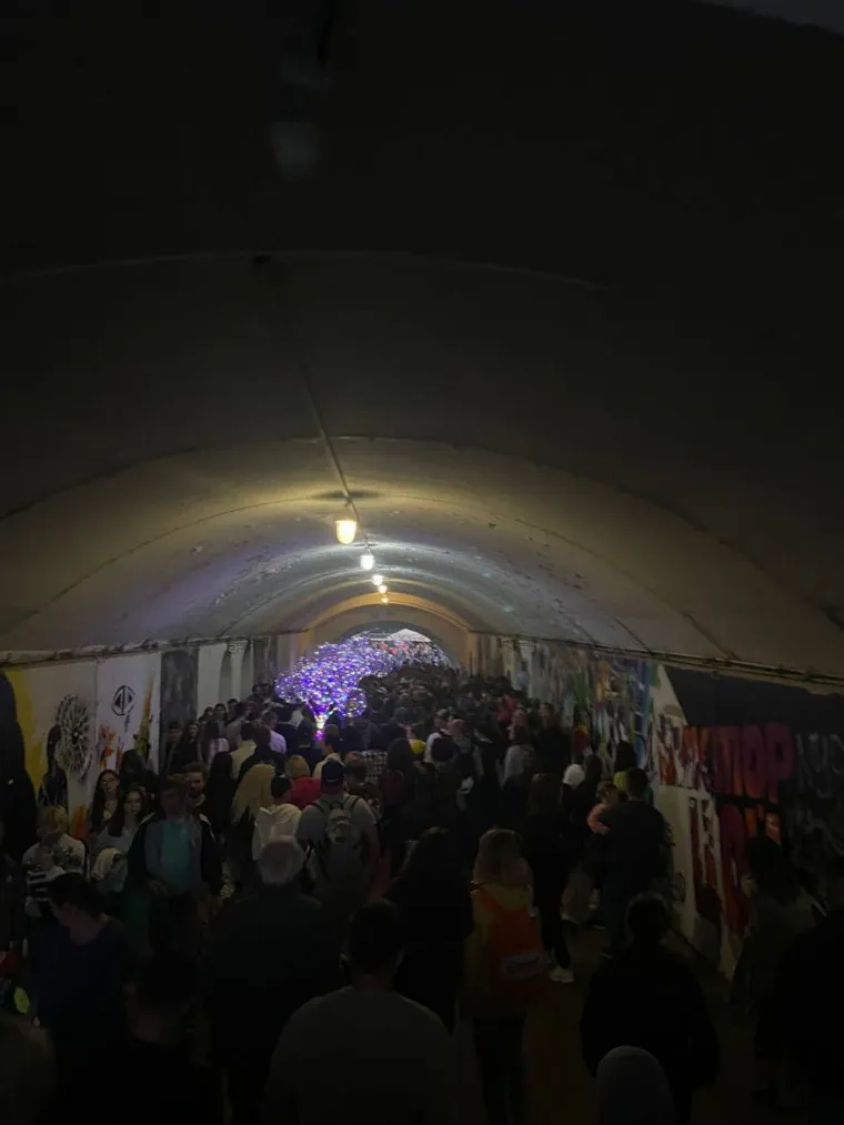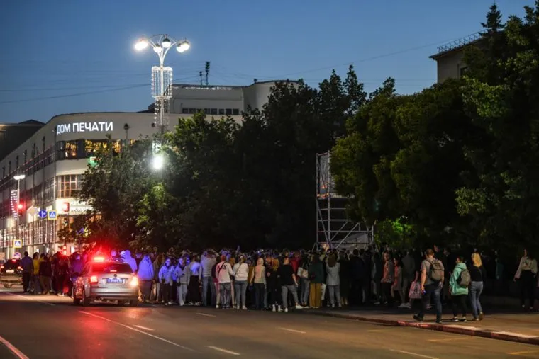 На проспекте Ленина множество народу, который на протяжении всей улицы от Плотинки до оперного театра Екатеринбурга выходит на проезжую часть. Сотрудники ДПС специально выставили машины вокруг пешеходных переходов, чтобы создать зону между машинами и толпой. Однако, некоторые гости фестиваля все равно выходят за ограждения.