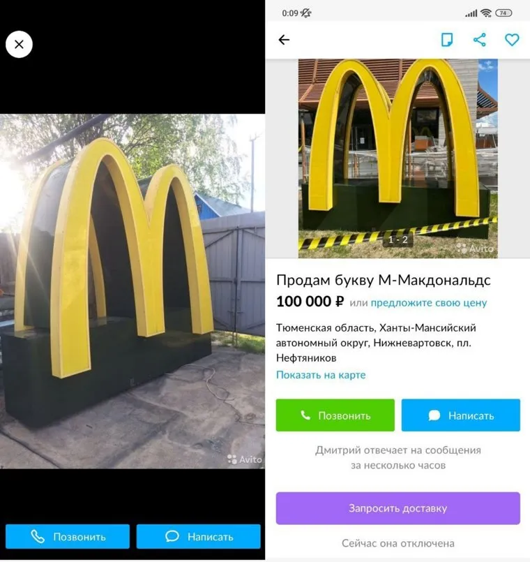«Продам букву „M“ — Макдональдс, 100 000 рублей. Состояние б/у», — написал в объявлении автор, прикрепив два фото. На одном изображена демонтированная конструкция возле ресторана сети в центре Нижневартовска, а на втором логотип уже находится на закрытой территории, судя по фото, частного участка.