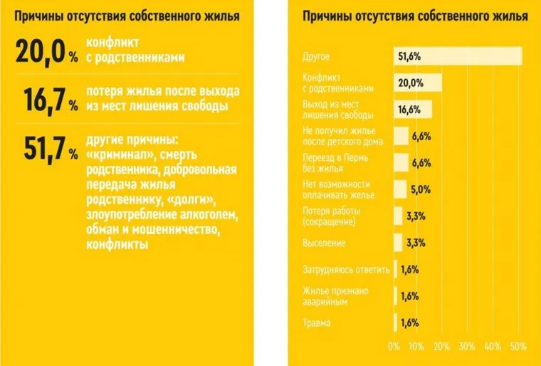 «Наиболее частыми причинами отсутствия жилья респонденты указали конфликт с родственниками (20%) и выход из мест лишения свободы (16,7%). При этом 51,7% указали собственную причину. Среди них были, например: „криминал“, смерть родственника, добровольная передача жилья родственнику, „долги“, злоупотребление алкоголем, обман и мошенничество», — рассказали URA.RU активисты.