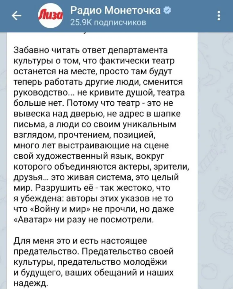 «Забавно читать ответ Минкульта РФ о том, что фактически „Гоголь-Центр“ останется на месте, просто там будут работать другие люди и сменится руководство. Не кривите душой, театра больше нет. Театр — это не вывеска над дверью, а люди со своими взглядами, прочтениями и позицией <…> Для меня это [закрытие] и есть настоящее предательство. Предательство своей культуры, молодежи, надежд и обещаний», — говорится в сообщении.