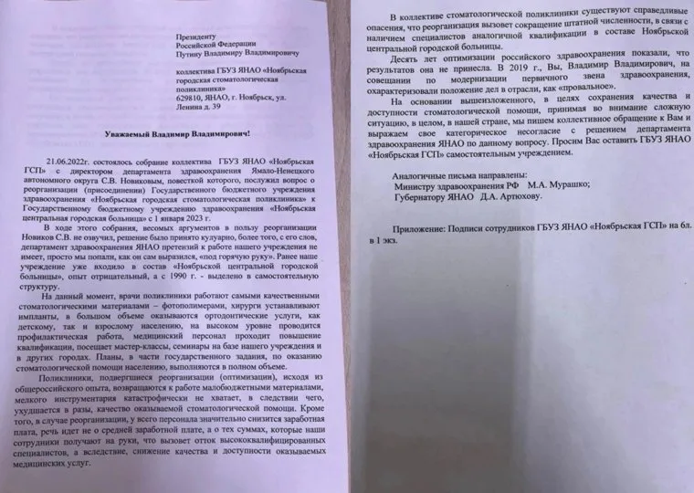 «Поликлиники, подвергшиеся реорганизации, исходя из общероссийского опыта, возвращаются к работе малобюджетными материалами, мелкого инструментария катастрофически не хватает, вследствие чего, ухудшается в разы, качество оказываемой стоматологической помощи. Кроме того, в случае реорганизации, у всего персонала значительно снизится заработная плата, речь идет не о средней зарплате, а о тех суммах, которые наши сотрудники получают на руки, что вызывает отток высококвалифицированных специалистов, а в следствие, снижение качества и доступности оказываемых медицинских услуг. В коллективе стоматологической поликлиники существуют справедливые опасения, что реорганизация вызовет сокращение штатной численности, в связи с наличием специалистов аналогичной квалификации в составе Ноябрьской центрально городской больницы», — говорится в документах, опубликованных в группе «Злой Ноябрянин».