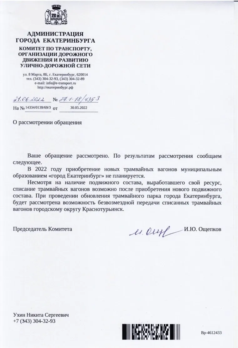 «Несмотря на наличие подвижного состава, выработавшего свой ресурс, списание трамвайных вагонов возможно после приобретения нового подвижного состава. При проведении обновления трамвайного парка города Екатеринбурга, будет рассмотрена возможность безвозмездной передачи списанных трамвайных вагонов городскому округу Краснотурьинск», — говорится в письме, подписанном председателем комитета по транспорту Игорем Ощепковым.