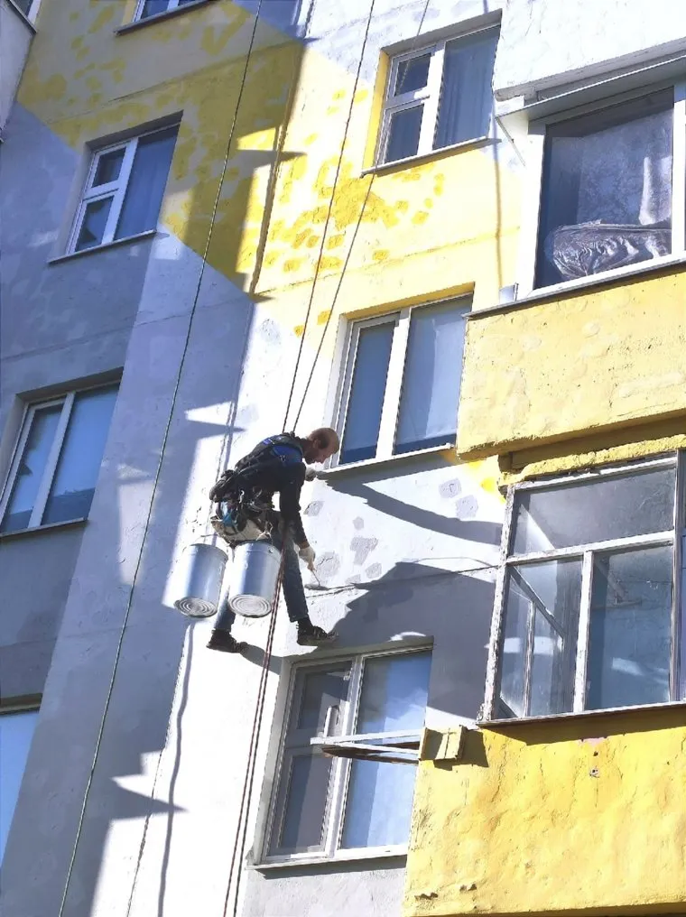 Подрядчик закрашивает дефекты здания краской другого цвета