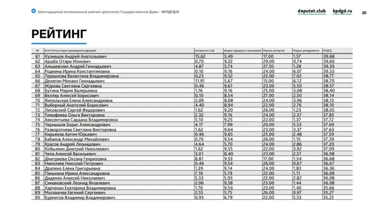 «Исследование проводилось с апреля по июнь. Учитывались возможности депутата мобилизовать сторонников, законотворческая активность, медийность и работа в регионах», — указано в пояснениях к рейтингу.