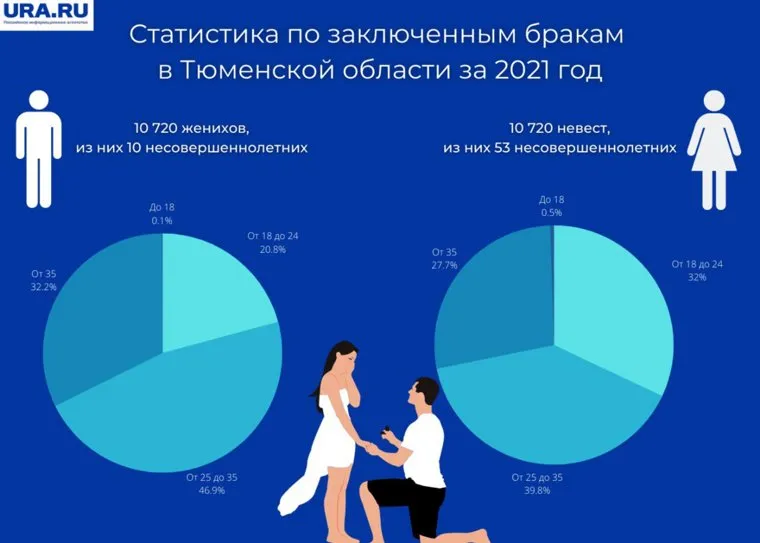«В 2021 году в Тюменской области было заключено 10 720 браков. При этом среди женихов несовершеннолетними были 0,1%, среди невест — 0,5%», — рассказали URA.RU в Тюменьстате.