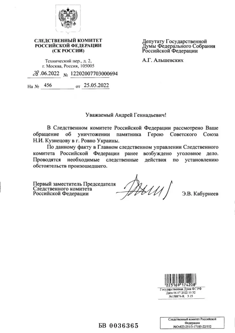 «В следственном комитете рассмотрено обращение об уничтожении памятника герою Советского союза Н. И. Кузнецову в г. Ровно Украины. По данному факту в Главном следственном управлении Следственного комитета РФ ранее возбуждено уголовное дело. Проводятся необходимые следственные действия по установлению обстоятельств произошедшего», — говорится в ответе ведомства.