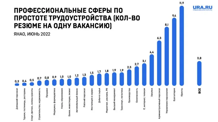 Также в агентстве добавили, что сегодня в ЯНАО проще всего трудоустроиться в профессиональных сферах «Домашний персонал» (0,3 резюме на вакансию), «Туризм, гостиницы, рестораны» (0,4), «Спорт, фитнес, красота» (0,5), «Строительство, недвижимость» (0,7), «Продажи» (0,8), «Медицина, фармацевтика» (0,9), «Наука, образование» (1), «Банки, инвестиции» (1) — именно здесь наблюдается самая низкая конкуренция среди соискателей, имеет место выраженный кадровый дефицит. В нескольких профессиональных сферах наблюдается повышенная конкуренция соискателей за рабочие места. В частности, это «Управление персоналом» (8,1 резюме на вакансию), «Бухгалтерия» (9,4) и «Юристы» (11,9).