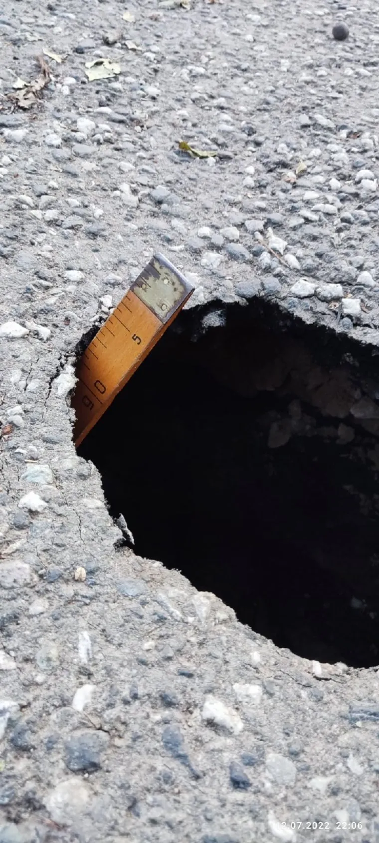 «Я увидел провал 12 июля, на первый взгляд кажется, что он небольшой, но, когда я сходил домой за метровой линейкой для того, чтобы понять, насколько глубокая там дыра, я убедился, что необходимо предпринимать скорейшие действия по устранению этого провала, так как при последующих дождях велик риск, что его диаметр и глубина могут увеличиться», — рассказал Андрей, житель Соликамска. Измерение провала в глубину показало, что даже метровая линейка не достает до дна.