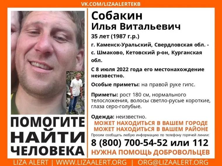 «Пропал Собакин Илья Витальевич, 35 лет (1987 г. р.). С 8 июля 2022 года его местонахождение неизвестно. Особые приметы: на правой руке гипс», — написано на странице сообщества в соцсети «ВКонтакте».